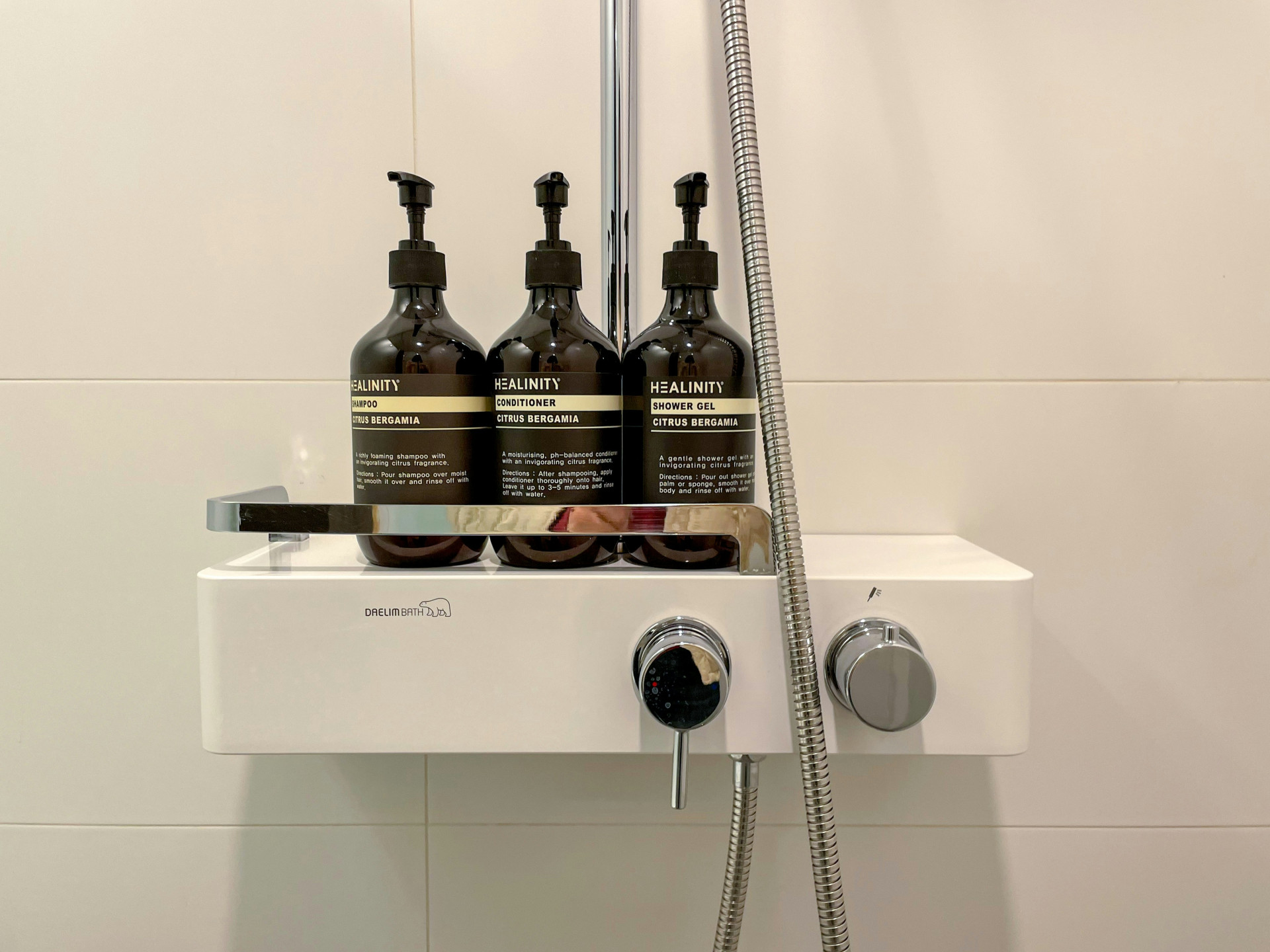 Suihkujärjestelmä on varustettu ShowerTablet 350 -termostaatilla, jossa on integroitu hylly anodisoidusta alumiinista. Termostaatissa on eristetty vedenkulku, 40 °C turvarajoitin ja käyttö pyörösäätimillä. Järjestelmä ei salli kahden ulostulon samanaikaista käyttöä, mikä varmistaa vakaan veden lämpötilan.